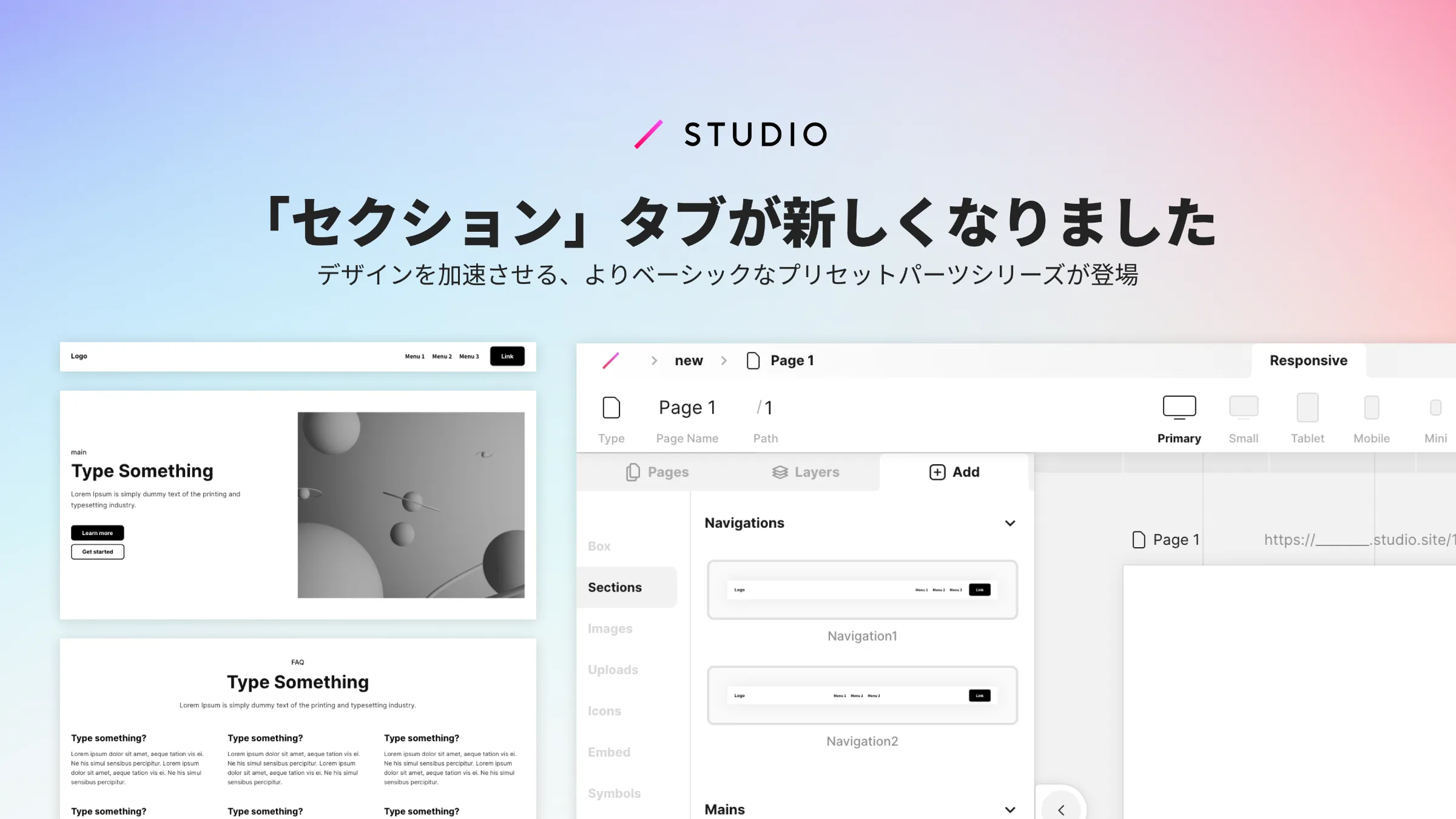 よく登場するレイアウトの基本的なレスポンシブの整った骨組みがセクション単位で準備されているので、初心者の方もSTUDIOマスターの方も、ワイヤーフレーム構築作業の時間を短縮し、デザインの研鑽により多くの時間を割くことができます。