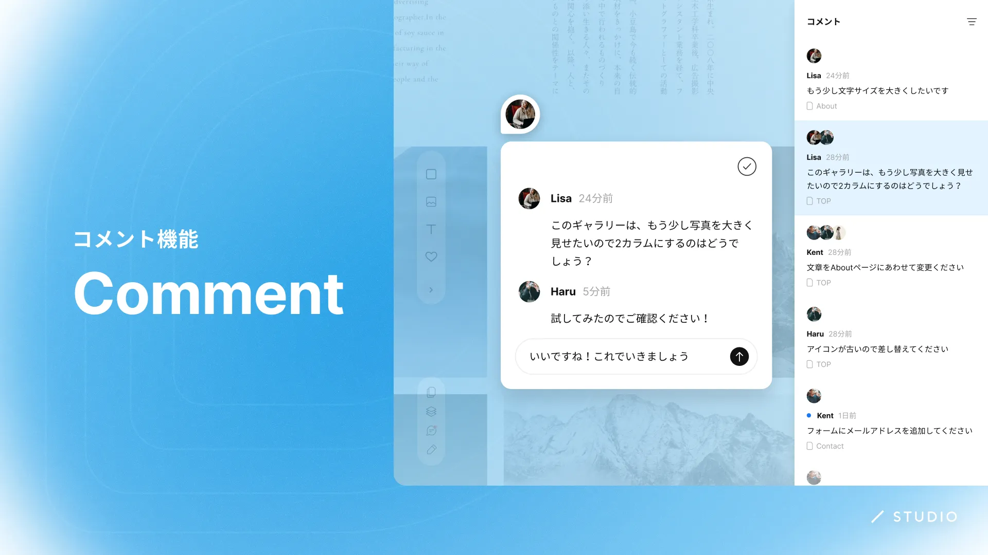 エディタにコメント機能が登場。デザインへのフィードバックまでSTUDIO上に一元化